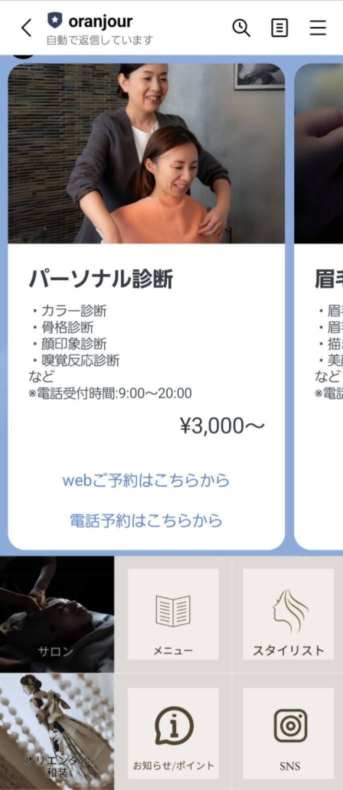 リッチメニューをタップすると、事前に設定していたカードタイプメッセージがトーク画面に送信されます!