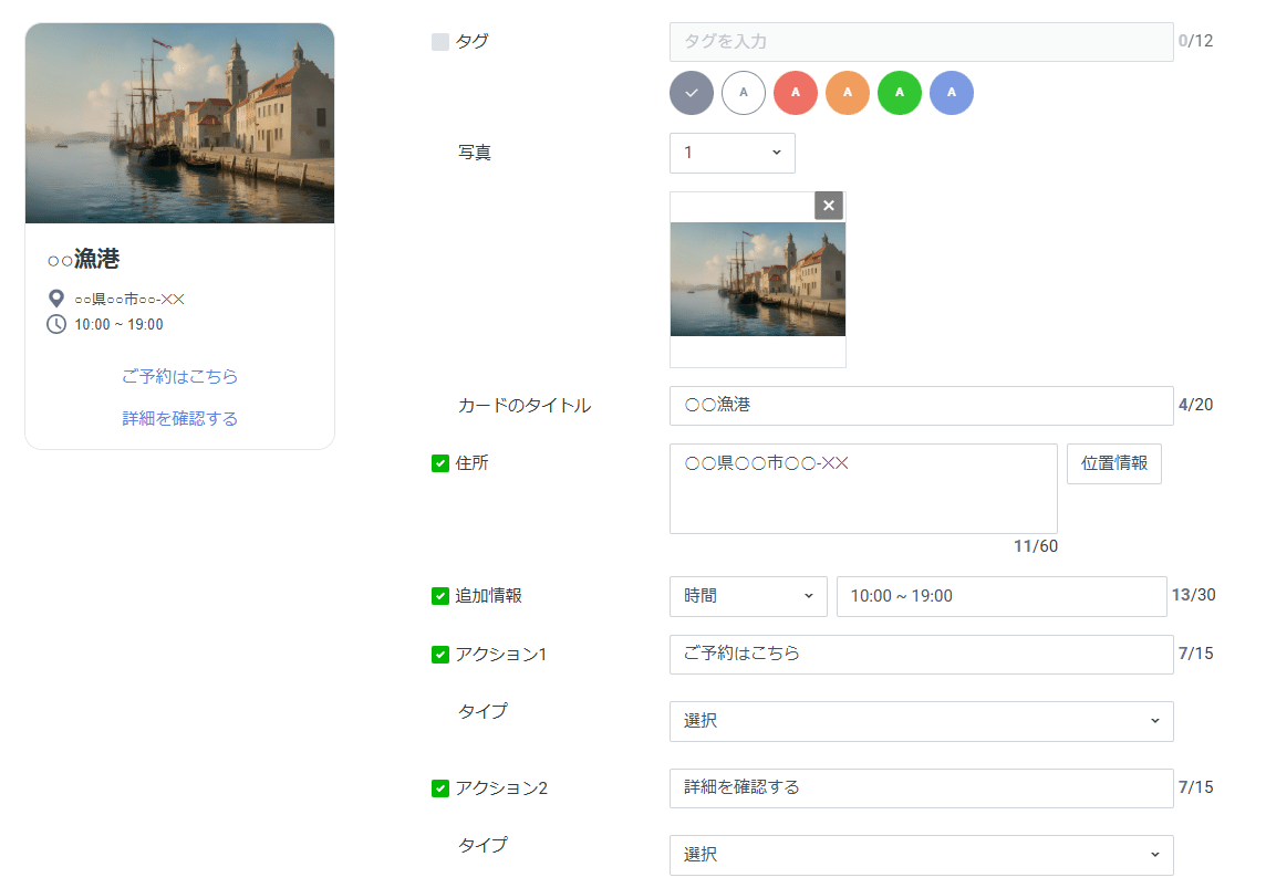 住所や時間を入れることができるので、店舗やスポットの紹介に優れています!